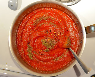 1) In a saucepan over medium heat, stir together tomato puree, red pepper flakes, black pepper, basil, and sugar. Bring to a simmer and cook 10 minutes.
